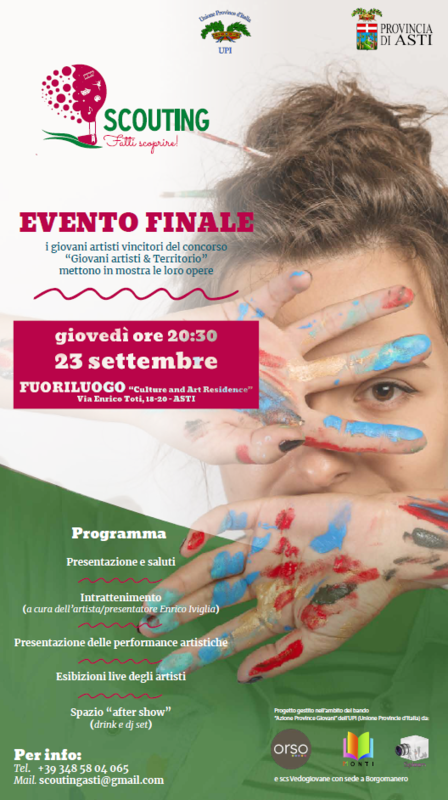 Giovedì 23 settembre 2021, dalle ore 20:30 nel locale "FuoriLuogo" di Asti (via Enrico Toti, 18-20) è in programma l'evento finale del progetto "Scouting", in cui saranno presentate opere di giovani artisti finalizzate alla promozione del territorio.