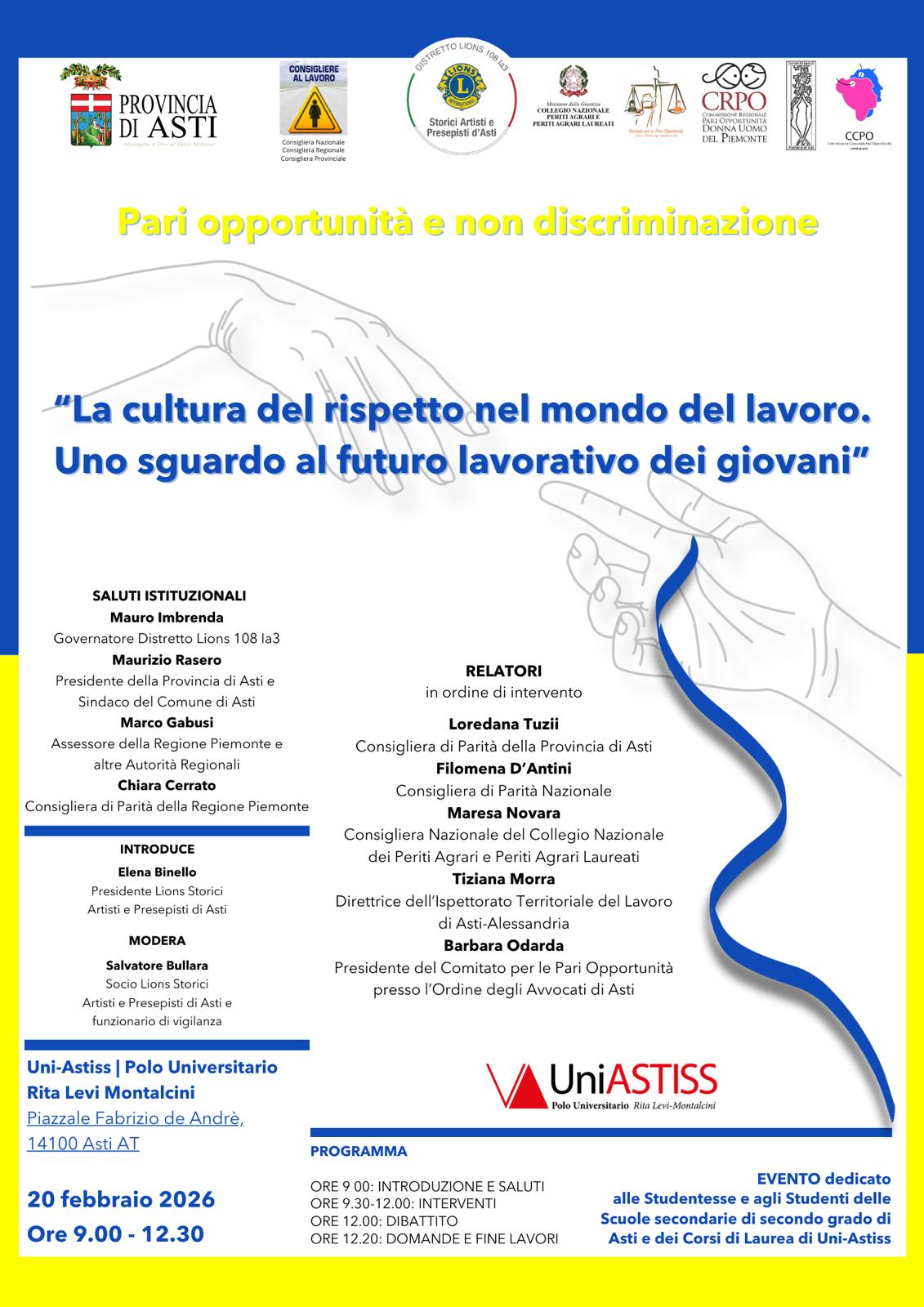 “La cultura del rispetto nel mondo del lavoro. Uno sguardo al futuro lavorativo dei giovani”: è il titolo del convegno in programma venerdì 20 gennaio, dalle 9 alle 12:30, al polo universitario Rita Levi Montalcini, piazza Fabrizio De Andrè, Asti.